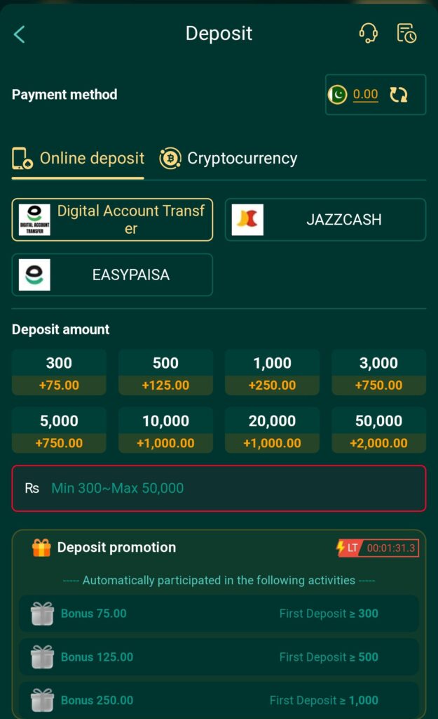 Users can deposit funds using bank transfer, mobile wallets, and online payment methods.